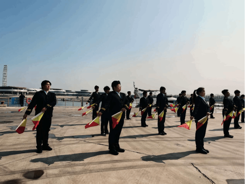 活动中,学院旗语队队员以精准划一的动作,演示“强国有我,请党放心”“缅怀革命先烈,强国复兴有我”等旗语,以航海人特有的方式传递守护海疆的坚定信念,展现了扎实的专业素养与昂扬的精神风貌。