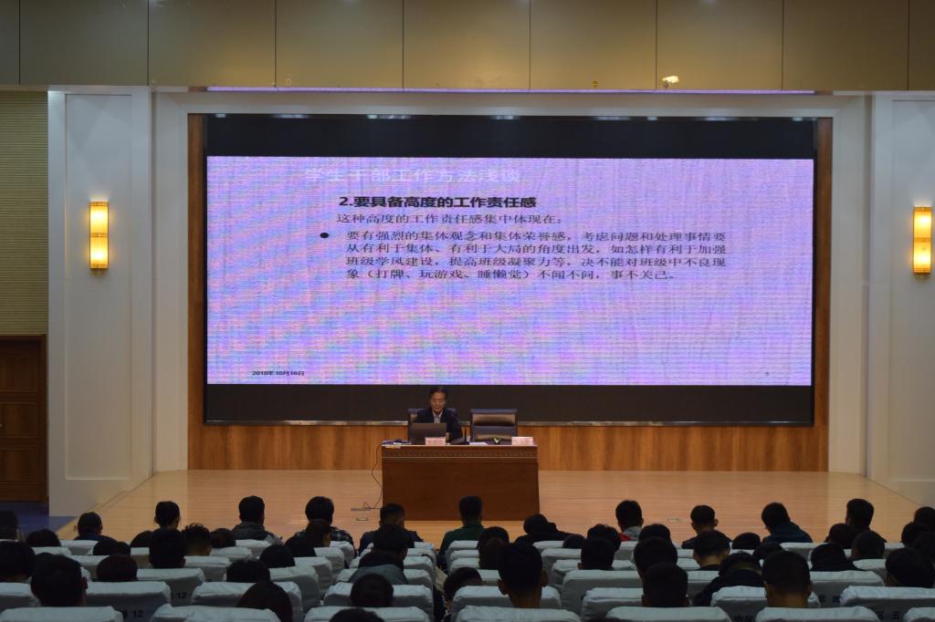 会上,学生处处长张锡功主要从什么是学生干部、学生干部的形象和作用、学生干部应具有的素质、如何做好学生干部、学生工作方法总结五个方面对学生干部进行培训。张处长强调,学生干部既是学生、又是干部,要做到让学生“称心”,让老师“放心”,在服务同学的过程中努力提升自我;要处理好工作与学习之间的关系,做到品学兼优,要“多看、多问、多做、多思考”,虚心向老师、师兄师姐和同学们学习、求教,讲究工作的方式方法,提高工作能力。