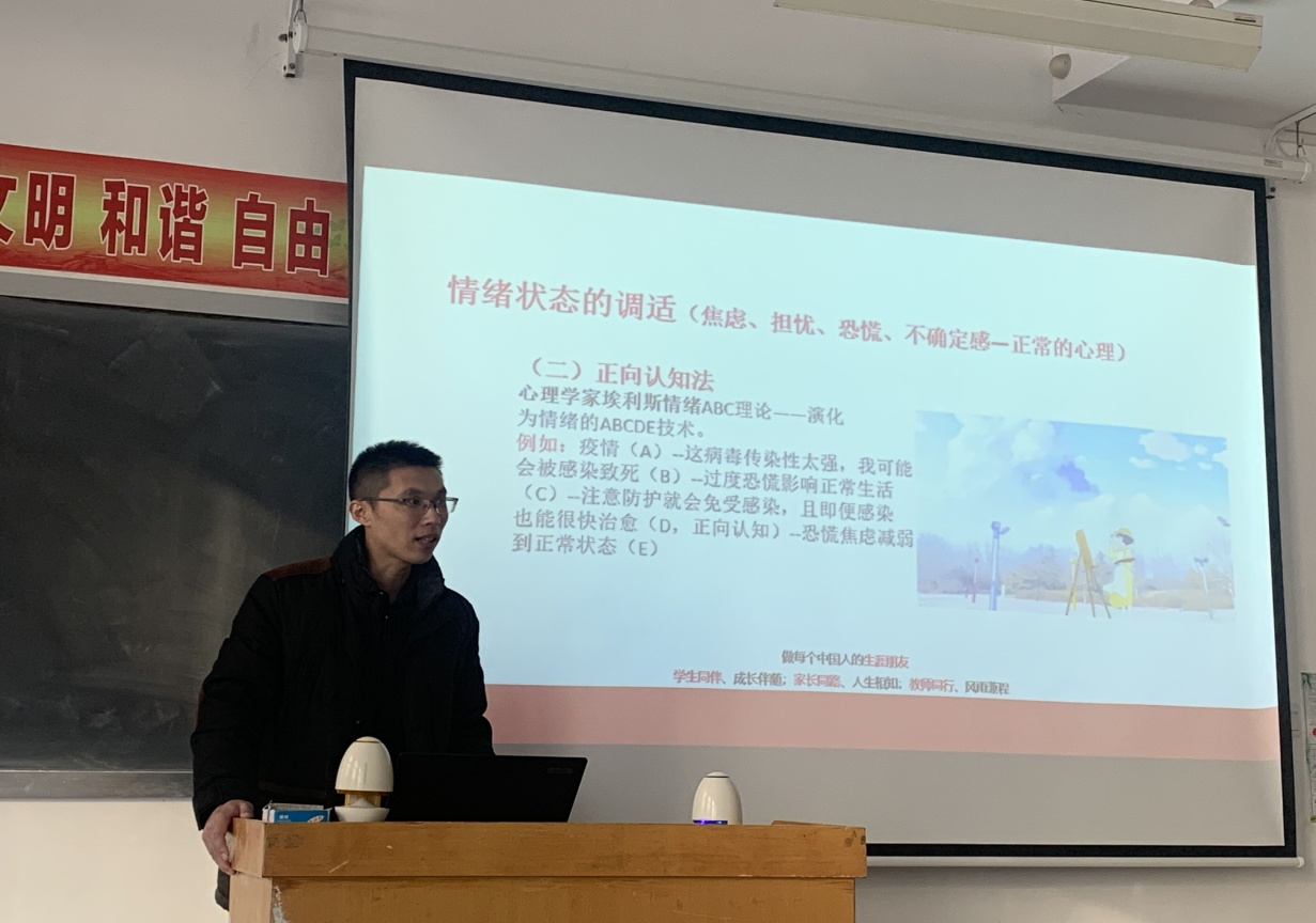 王老师本次授课的题目是《大学生心理调适、情绪管理、危机干预及动机激发》。王老师首先通过数据展示了竞争日趋激烈和社会信息繁杂的今天,学生的心理问题已引起了全社会高度重视。其次讲解了“大学生心理问题的行为表征”,而后讲解了“心理和行为问题相应的表现及分析”,最后讲解 “教师该如何根据实际情况帮助学生学会面对压力和调整情绪”。