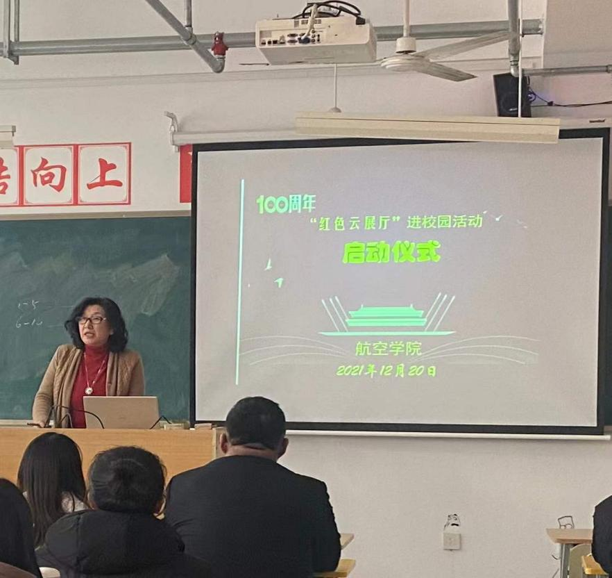 12月20日下午,航空学院举行“红色云展厅”进校园活动启动仪式。全体教职工和学生入党积极分子参加。启动仪式上航空学院院长马云芹传达了上级和学校的相关指示精神,并对本支部如何开展“红色云展厅”进校园活动的具体内容和活动的责任范围进行了具体部署。马院长强调,此项活动是深入学习贯彻习近平总书记在庆祝中国共产党成立 100 周年大会上的重要讲话和党的十九届六中全会精神,进一步推动党史学习教育向纵深发展的又一项重要举措,希望全体师生积极参与,在活动中深刻理解马克思主义为什么“行”、中国共产党为什么“能”、中国特色社会主义为什么“好”,以强化理想信念,厚植爱党情怀,坚定跟党走的信心和决心。
