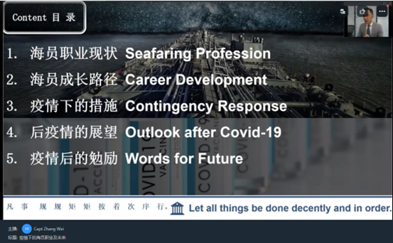 近日,航海学院联合东弘国际海事集团开展《疫情形势下的海员职业及未来》线上讲座。东弘国际海事集团资深船长张伟作为本次讲座主讲,从海员职业的现状、海员成长的路径、疫情下的措施、后疫情的展望等方面进行深入分析。中国是全球应对疫情最高效的国家,一系列规则和禁令的制定使得中国港口成为海员换班的首选地点,这给中国海员的职业发展带来得天独厚的优势。张船长勉励同学们一定要抓住这次中国海员高速发展的机遇,努力学习各种知识,锻炼自己的专业技能,成长为一名优秀的海员,在实现自我人生价值的同时为我国的航运事业发展助力。