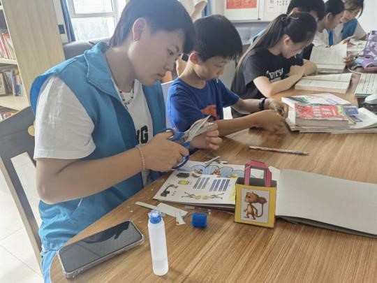 回到党群服务中心志愿者们投身于公益,辅导小朋友们做作业,提前预习下学期的课本,带着他们游戏和手工。在活动过程中,志愿者发现了性格内向不爱说话的小朋友,通过与小朋友亲密接触和交流互动,也渐渐的使他放下了戒备,主动向志愿者敞开了心扉,最终和志愿者了打成一片。