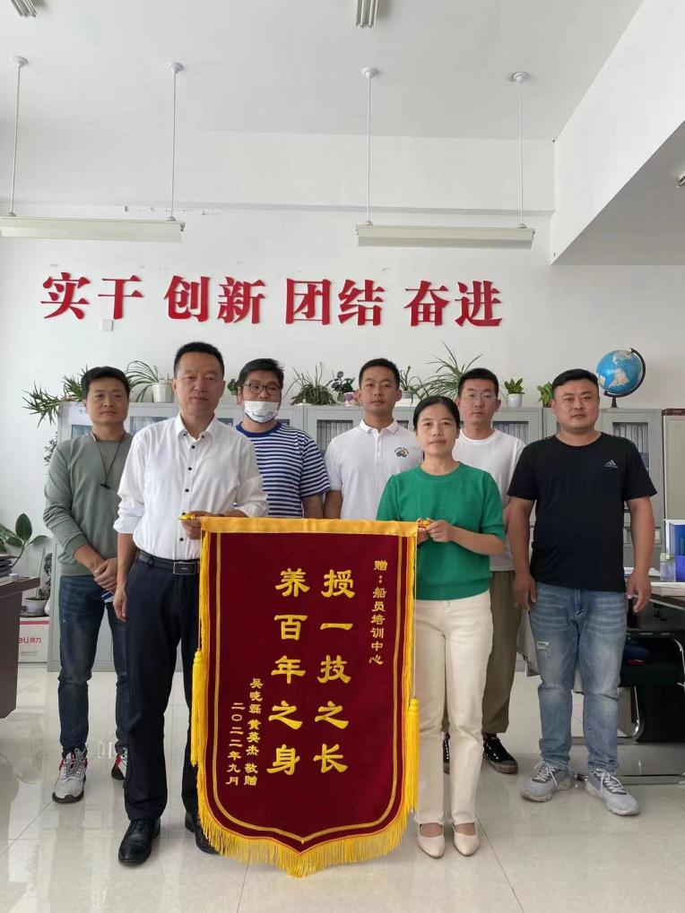 近日,学校第2022008期值班水手班学员代表将写有“授一技之长 养百年之身”和“言传身教指导有方 关爱有加胜似亲人”的两面锦旗送到了航海学院办公室和专业教师石凡东老师手中,对学院工作人员及石凡东老师在培训学习和考试之间的细致关怀表达了深深的感激之情。