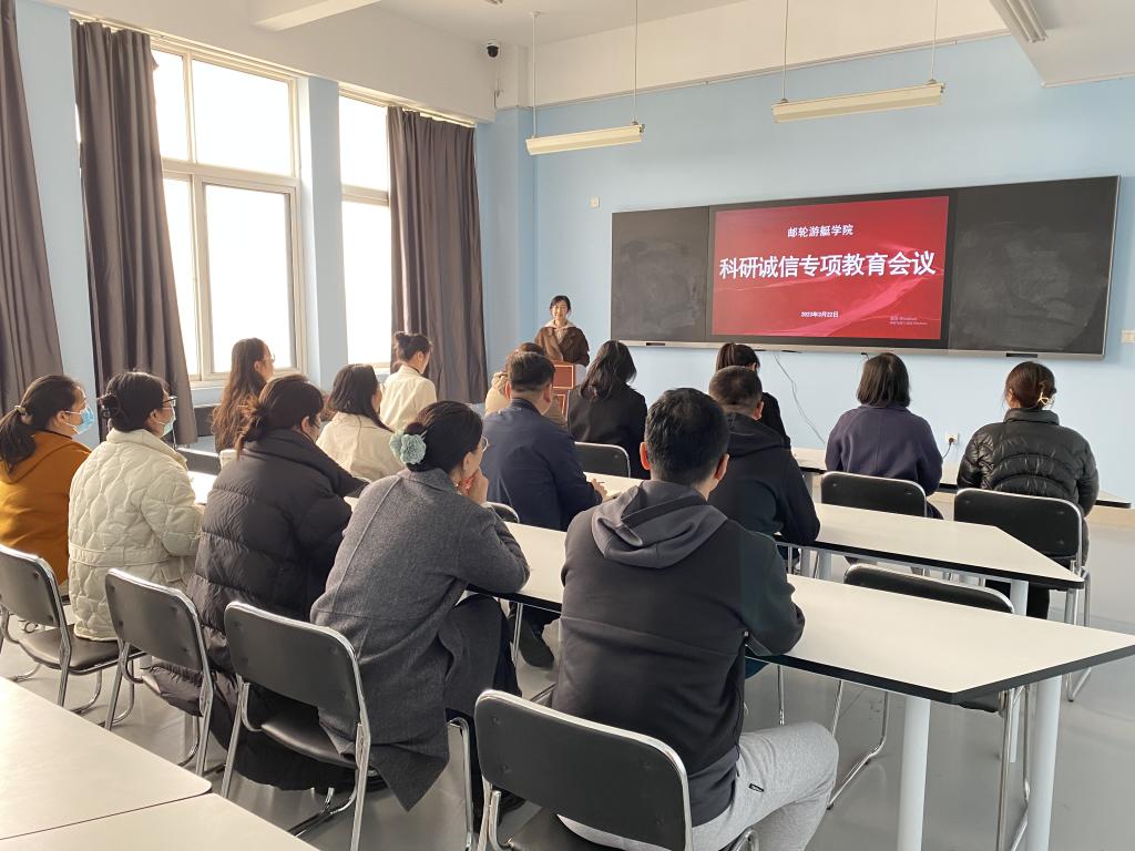 近日,为深入贯彻落实政府相关文件精神要求,提升学院广大教师的科学道德精神,涵养优良学风,营造客观务实的学术氛围和环境,学院全体教师在2305会议室开展科研诚信主题专项教育活动。邮轮游艇学院党政班子成员、全体教职工参与活动。活动由院长助理朱妮妮主持。