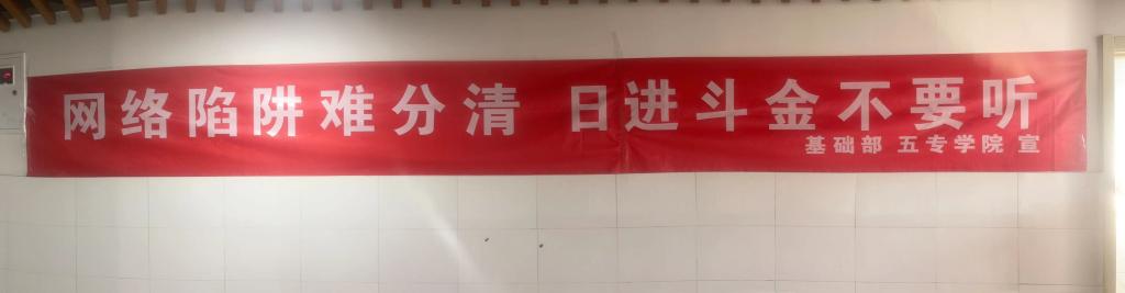 活动1 主题宣传。学院通过悬挂宣传条幅,张贴宣传小海报等形式向同学们传递防诈知识。