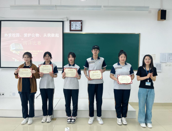 赛场上,同学们声情并茂,各展所长,以“感恩母校,爱校如家”为主题,从学院的实际出发,结合自身体验,向学院全体师生发出倡议:热爱学校、爱护公物、从我做起。最终,经过激烈角逐,11名同学脱颖而出,分获奖项,参赛评委为其颁发荣誉证书并做出总结点评。