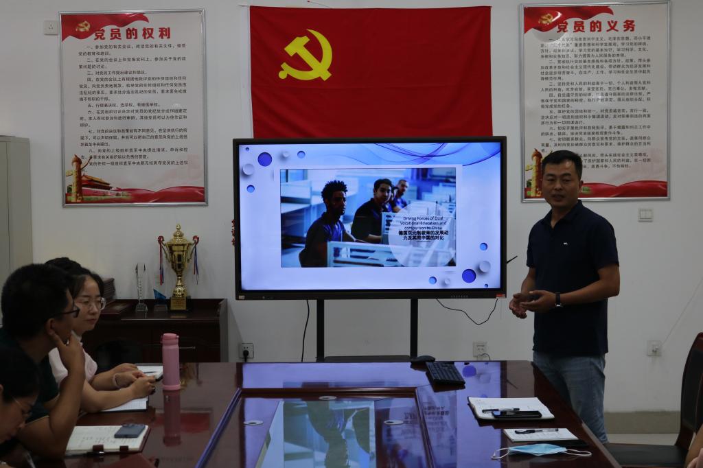 会上,暑期参训的11位教师逐一进行了汇报。他们结合自己参训的所见、所思、所想,从不同的方面将自己的学习心得与大家做了分享。张燕燕老师就新型数字化职业教育4.0给大家进行了解读;孙健壮老师就德国双元制教育的发展动力及同中国的对比进行了剖析;杨静老师就航海类专业课程课程思政的开发进行了分享;张健老师就基于现代学徒制的特色二级学院建设与运用进行了梳理;李玉升老师就职业院校“双师型”教师队伍培养路径进行了交流;王慧娟老师就职业院校教师教学能力提升进行总结;纪政辉老师就“1+X”证书制度实用英语交际能力培养进行了汇报。