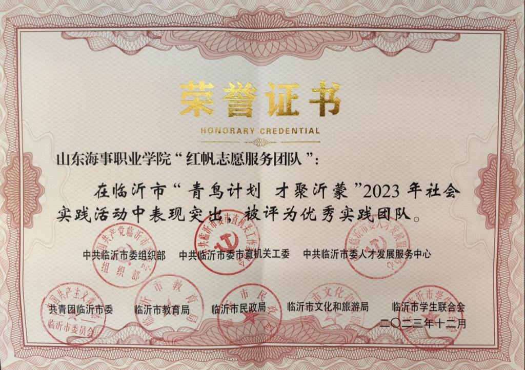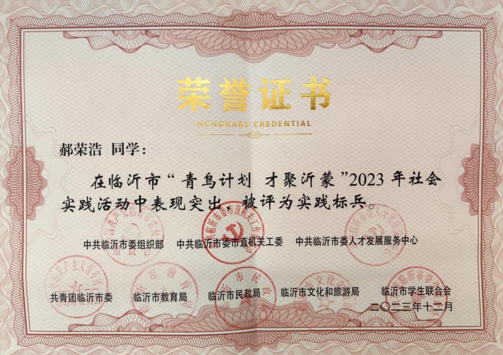 近日,由中共临沂市委组织部、中共临沂市委市直机关工委、中共临沂市委人才发展服务中心、共青团临沂市委、临沂市教育局、临沂市民政局、临沂市文化和旅游局、临沂市学生联合会联合发文,对2023年大学生暑期“三下乡”社会实践中的先进集体和先进个人进行表彰,机电工程学院“红帆”志愿服务队荣获“2023年社会实践活动优秀实践团队”、机电工程学院郝荣浩同学荣获“2023年社会实践活动实践标兵”。