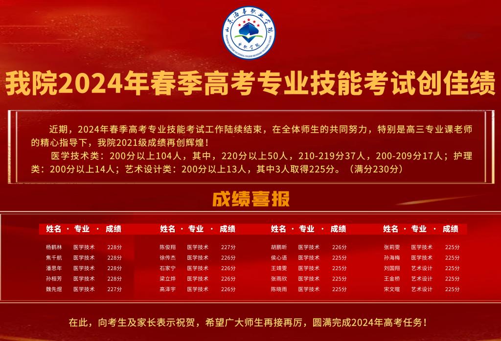 近期,2024年春季高考专业技能考试工作陆续结束,在全体师生的共同努力,特别是高三专业课老师的精心指导下,中职学院2021级成绩再创辉煌!医学技术类:200分以上104人,其中,220分以上50人,210-219分37人,200-209分17人;护理类:200分以上14人;艺术设计类:200分以上13人,其中3人取得225分。(满分230分)