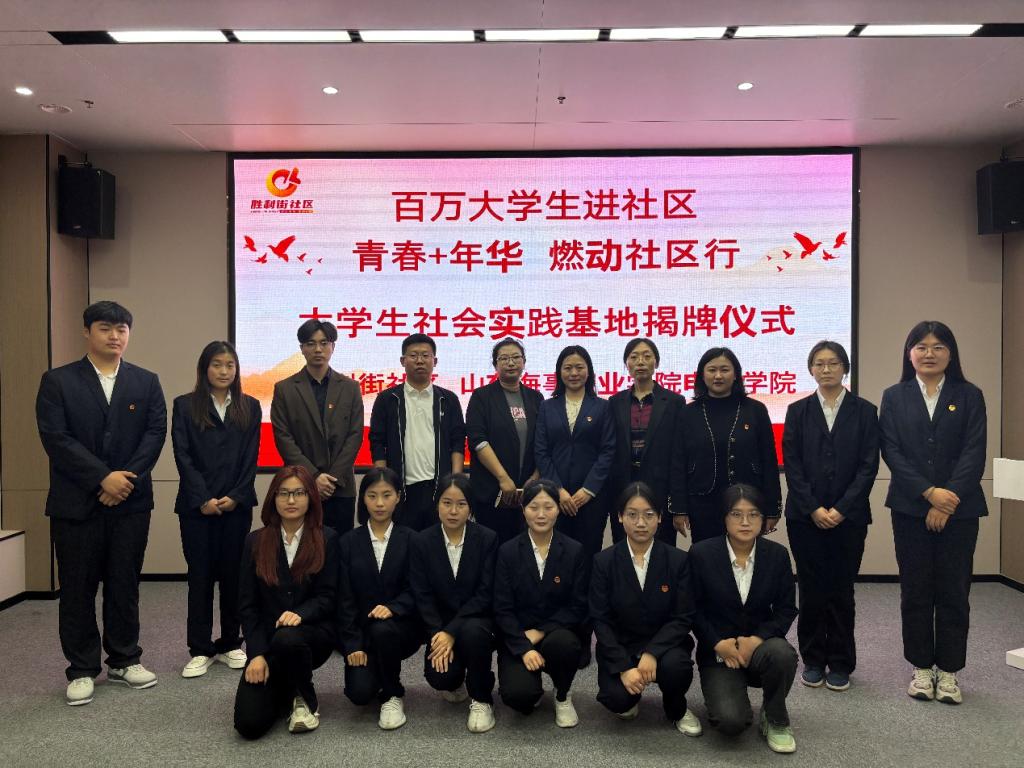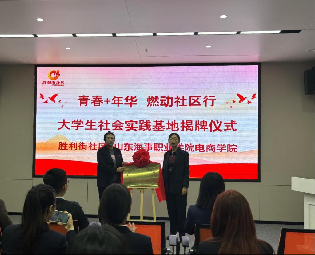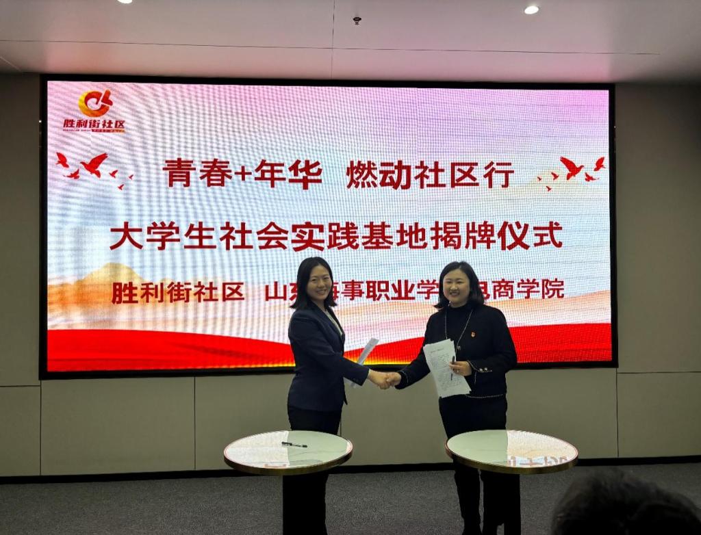 为响应团中央大学生社区实践计划和“百万大学生进社区”社会实践工作安排,切实提升基层共青团实践育人质量,让学生们在实践课堂中受教育、长才干、做贡献。4月23日,电商学院在潍坊市奎文区东关街道胜利社区委员会举行“青春+年华 燃动社区行”大学生社会实践基地签约揭牌仪式。东关街道党工委组织委员徐浩,东关街道党工委宣传统战委员、团工委书记芦鑫,街道社会事务办副主任宋驰,胜利街社区党委书记、居委会主任王瑛,山东海事职业学院团委书记刁宁,电商学院党支部副书记常潇允及师生代表参加此次仪式。