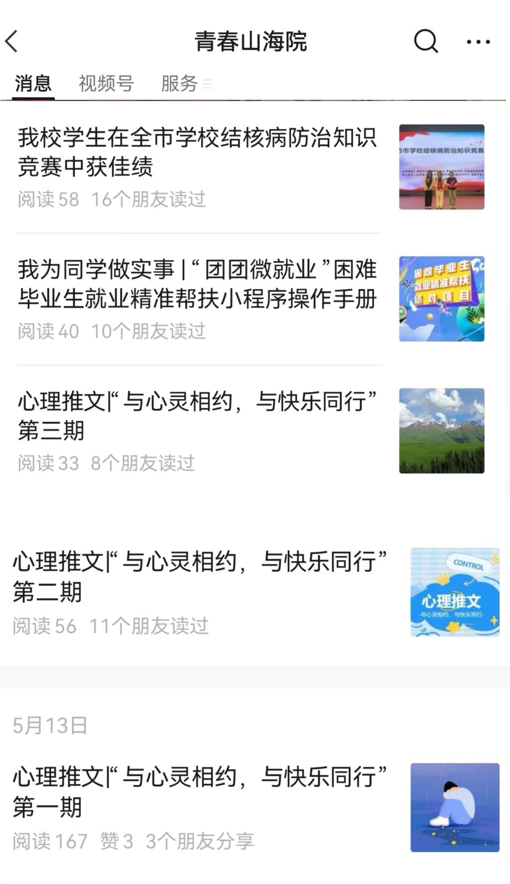 心理健康月活动期间,校团委在“青春山海院”微信公众号上发表心理舒缓知识等系列推文,普及心理知识,提高学生心理自我排解能力。