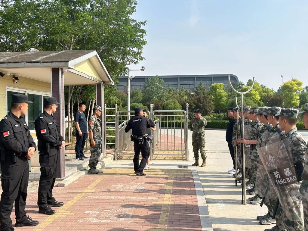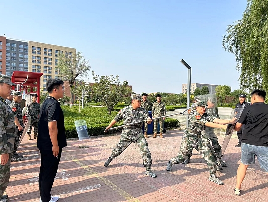 学校与滨海特警大队联合开展校园反恐防暴演练,提高学校安保人员防暴恐事件快速响应和应急防范能力,进一步筑牢校园安全防线。演练前,特警大队的同志对演练流程、职责分工、注意事项进行强调部署,并现场演示防暴盾、警棍、钢叉等安保器械的规范使用方法并模拟演练“歹徒”冲击校园场景。演练中,学校安保人员及时发现“歹徒”,迅速使用盾牌和警棍等进行警告阻拦,合力将“歹徒”制服,后立即向学校安全管理处报告并拨打110电话报警,整个演练处置流程环环相扣,参与人员分工明确,配合默契,处置手段合理高效。
