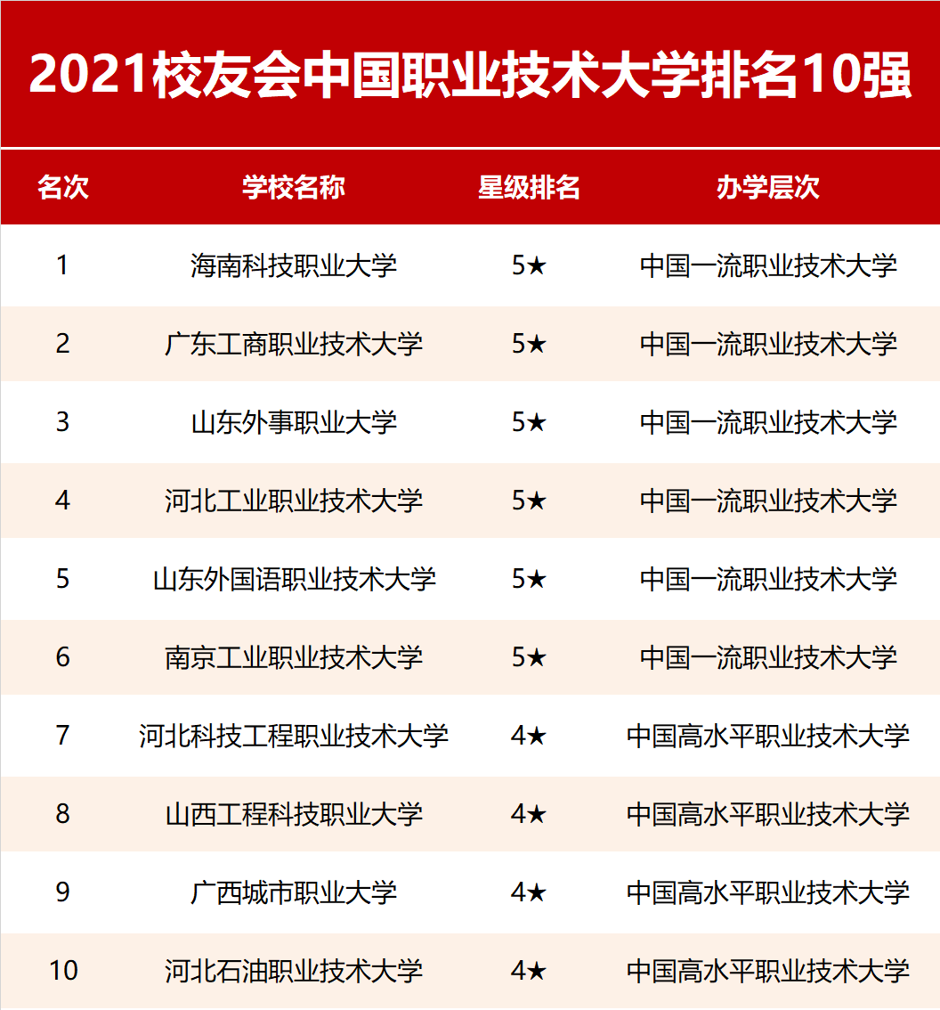 海南科技职业大学、广东工商职业技术大学、山东外事职业大学雄居2021校友会中国职业技术大学排名前3强。