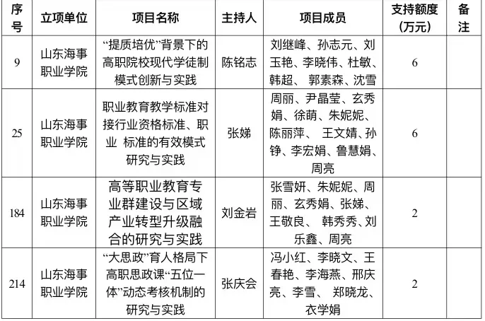根据《教育部 山东省人民政府关于整省推进提质培优建设职业教育创新发展高地的意见》(鲁政发〔2020〕3号)、《山东省教育厅 山东省财政厅关于开展山东省职业教育教学改革研究项目立项工作的通知》(鲁教职字〔2015〕11 号)和《山东省教育厅关于做好2021年度山东省职业教育教学改革研究项目申报工作的通知》(鲁教职函〔2021〕1号)精神,经山东海事职业学院申报、专家评审,全省高职、中职、相关高校和研究所共有519项省级教学改革研究项目入围立项名单,其中山东海事职业学院申报的项目中有4项成功获批立项,并均获经费支持,有两个项目分获6万元支持,两个项目分获2万元支持。立项项目目前已在省教育厅网站公示。立项名单如下:
