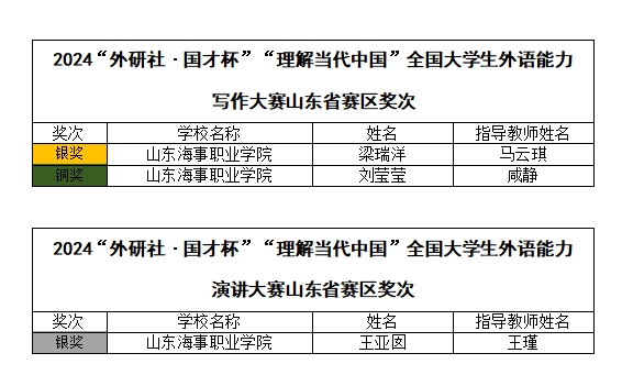 在写作大赛项目中,马云琪老师指导的2024级旅游管理专业梁瑞洋同学荣获银奖,咸静老师指导的2023级电子商务专业刘莹莹同学荣获铜奖;在演讲大赛项目中,王瑾老师指导的2023级物流管理专业王亚囡同学荣获银奖。
