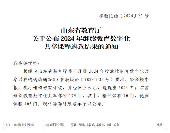 近日,山东省教育厅公布了 2024 年度山东省继续教育数字化共享课程遴选结果,我校《咖啡调制技能训练》课程成功入选。