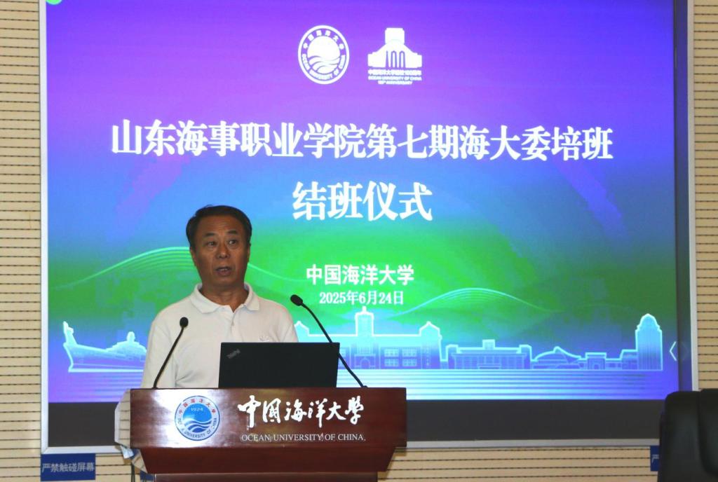 山东海事职业学院副校长宋志刚发表讲话,他向顺利结业的学员们致以热烈的祝贺,并向中国海洋大学在委培期间给予的专业指导表达诚挚谢意。宋校长对学员提出“海、实、新”三字嘱托,强调要以海为魂,深植海事专业根基,将海洋精神融入职业信仰;以实为帆,秉持工匠精神,在实践中锻炼过硬本领;以新为舵,紧跟行业技术变革,勇立时代潮头。