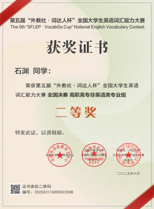 近日,由中国外语战略研究中心、中国外语教材与教法研究中心及上海外语教育出版社联合主办的第五届 “外教社・词达人杯” 全国大学生英语词汇能力大赛圆满落幕。我校学生在大赛中表现突出,于省赛阶段斩获39项奖项,包括特等奖1项、一等奖1项、二等奖15项、三等奖22项;在国赛阶段夺得二等奖1项,刷新历史成绩。