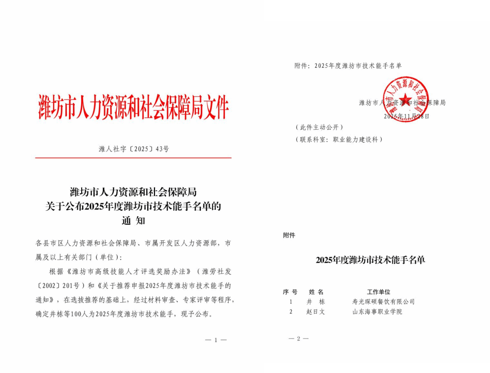 近日,潍坊市人力资源和社会保障局公布了2025年度“潍坊市技术能手”评选结果。邮轮游艇学院赵日文老师凭借精湛的专业技能和突出的行业贡献成功入选,荣获此项荣誉。