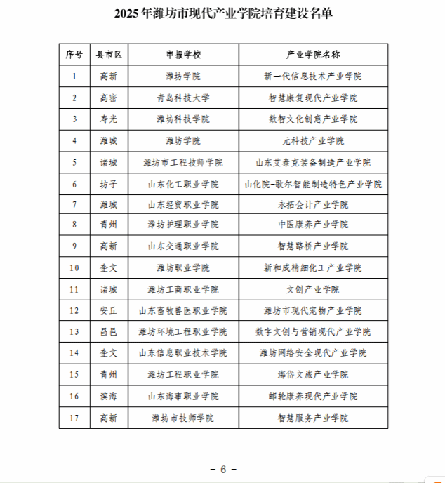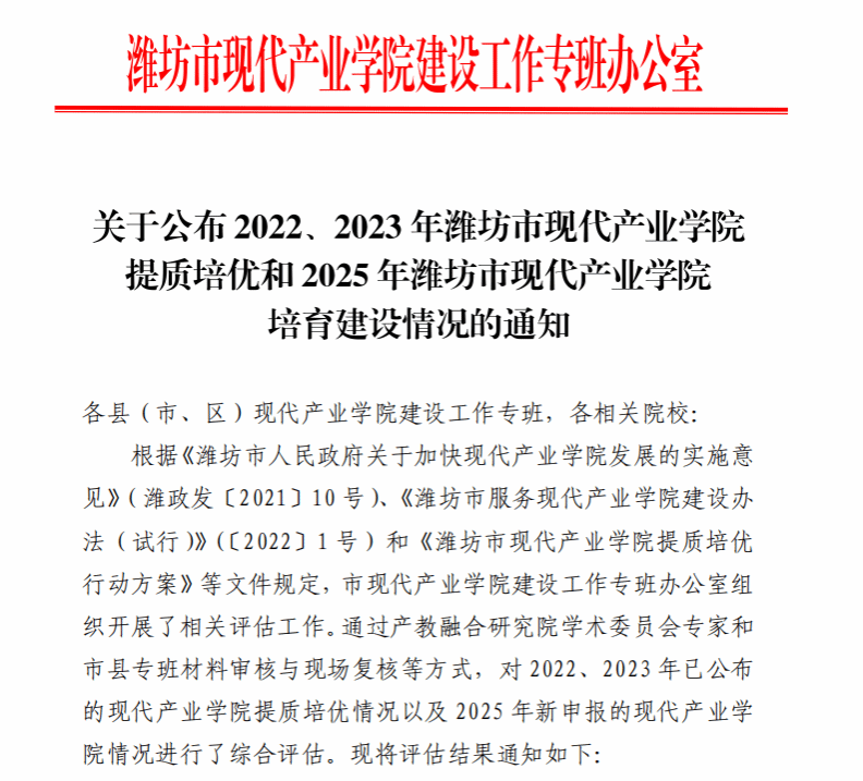 本次评选严格依据《潍坊市人民政府关于加快现代产业学院发展的实施意见》等文件要求,旨在推动校企共建产业学院提质培优、强化内涵建设。经过县(市、区)推荐、市级专家材料评审和现场考察等环节,全市最终确定21个现代产业学院列入2025年培育建设名单。