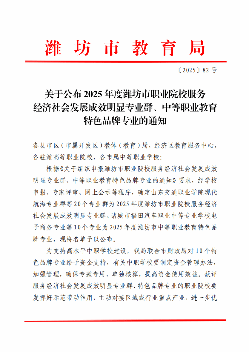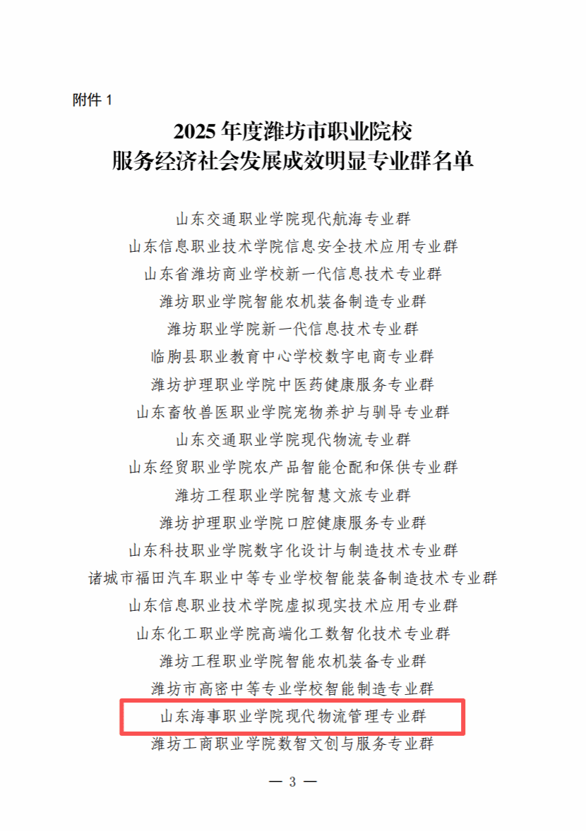 12月8日,潍坊市教育局公布了“2025年度潍坊市职业院校服务经济社会发展成效明显专业群”名单,我校现代物流管理专业群成功入选。