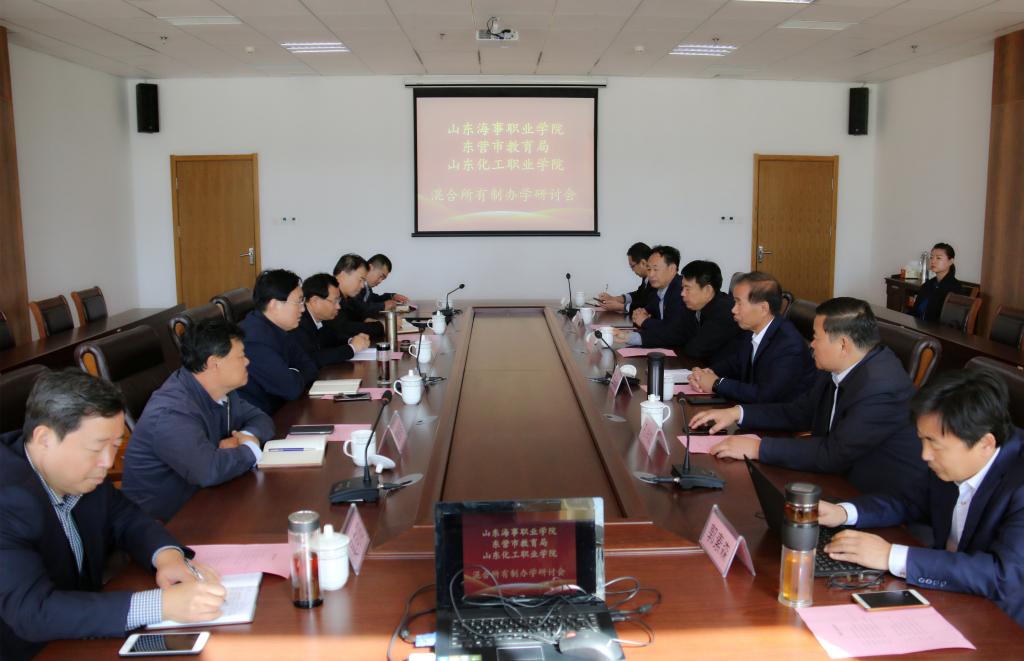 10月23日上午,东营市教育局局长孙红军,东营市人大常委会副秘书长耿考青,东营市财政局党组成员、市农业综合开发办公室主任隋振明,东营市财金公司副总经理马若飞等一行人到山东海事职业学院考察研讨混合所有制办学。潍坊市教育局局长徐友礼,潍坊市招院引校办公室副主任孔祥奴等,山东海事职业学院党委书记、院长王敬良,山东化工职业学院副院长李欣以及山东海事职业学院研究室主任郭素森等人参加了研讨活动。