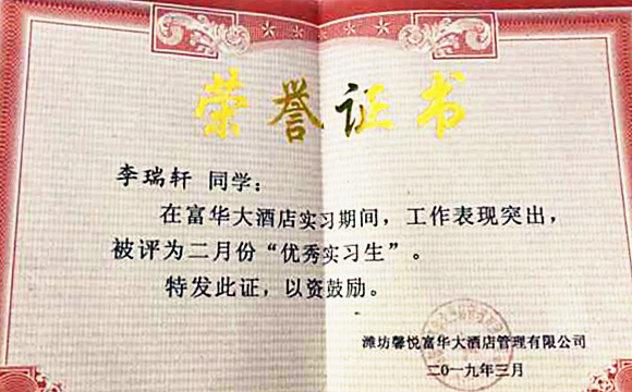 日前,潍坊富华大酒店向学院发来喜报,学院学子李瑞轩被评选为2019年潍坊富华大酒店“优秀实习生”,富华酒店对李瑞轩同学在实习期间的工作给予高度评价,特别赞赏他乐于助人、吃苦耐劳、爱岗敬业、踏实好学的优秀品格。
