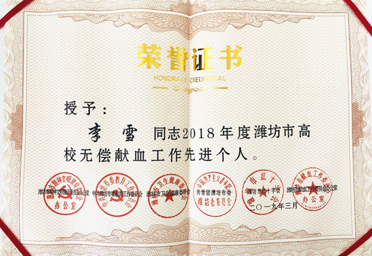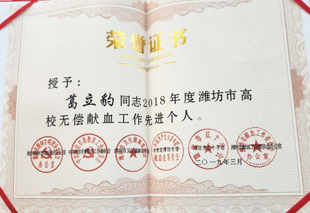 近日,2018年潍坊市高校无偿献血工作会议在山东交通职业学院举行,会上通报表彰了2018年全市高校无偿献血工作先进集体和先进个人,学院荣获“2018年度全市高校无偿献血志愿服务先进集体”荣誉称号,团委书记李雪、电商学院学生葛立豹荣获“2018年度全市高校无偿献血工作先进个人”荣誉称号,陈博、张庆效两名同学荣获“2018年度全市高校无偿献血志愿服务先进个人”荣誉称号,王正赢、翟建顺两名同学荣获”2018年度全市无偿献血爱心大学生”荣誉称号。2018年,在学院领导的高度重视和相关部门积极组织协调下,学院开展了“关爱生命,无偿献血”活动,学院通过举办多次献血知识公益讲座,利用校园广播站以及微信、微博等新媒体途径,进行了多种形式的广泛宣传,献血人数高达700余人,参与献血工作志愿服务的同学80余人,学院总献血数量超过170000毫升。荣誉属于每一位参与宣传、奉献鲜血的老师和同学们,今年,学院将继续重视并积极组织做好无偿献血工作,营造积极的献血氛围,积极弘扬助人为乐的奉献理念,鼓励和呼吁更多富有爱心的同学参与到献血活动中来。