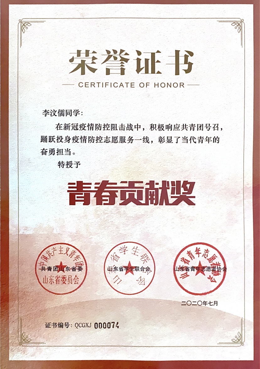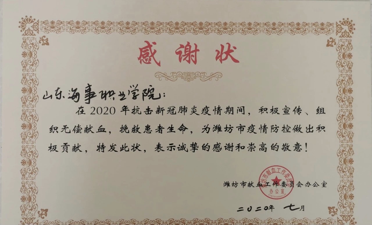 我校2019级安全技术与管理专业的李汶儒同学在新冠疫情防控阻击战中,积极响应共青团号召,踊跃投身疫情防控志愿服务一线,荣获山东省大学生“青春贡献奖”荣誉称号;2020年受新冠疫情影响,血液量告急,我校1077名师生参与到无偿献血活动中来,献血总量达到323100毫升,收到了潍坊市中心血站的感谢状;在第十二届山东省大学生科技节暨“辰华科技”杯第二届山东省大学生装备制造业创新大赛中,我校“机电与信息工程学院代表队”获得一等奖;我校青年志愿者协会被评为“滨海义工优秀团体奖”,其中,2020年度有5名学生被评为“大学生优秀义工”;学校承办滨海大学生首届公益年会。在毕业生团关系转接中,我校学社衔接率达到98%,受团市委表扬。