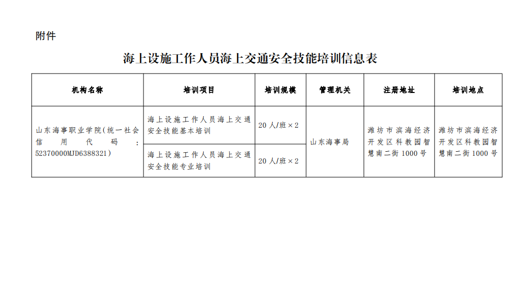 近日,中华人民共和国海事局颁发《关于公布山东海事职业学院开展海上设施工作人员海上交通安全技能培训的通知》,我校获批“海上设施工作人员海上交通安全技能培训”资质,获批规模为20人/班×2、专业培训规模为20人/班×2。目前,学校现已取得大副、大管轮等共计17个项目的船员培训资质。