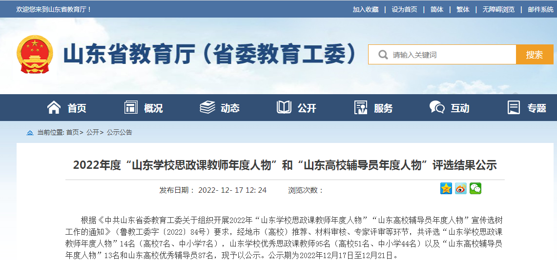 根据《中共山东省委教育工委关于组织开展2022年“山东学校思政课教师年度人物”“山东高校辅导员年度人物”宣传选树工作的通知》(鲁教工委字〔2022〕84号)要求,本次评优共评选“山东高校辅导员年度人物”13名和山东高校优秀辅导员87名。冯小红、都炜刚老师凭借突出的专业素养和丰富的育人实践,经过多个环节层层筛选,脱颖而出,成功入围“山东学校优秀思政课教师”“山东高校优秀辅导员”名单。