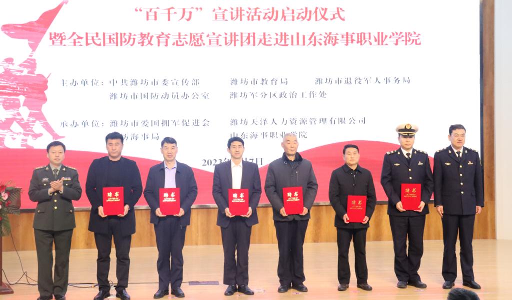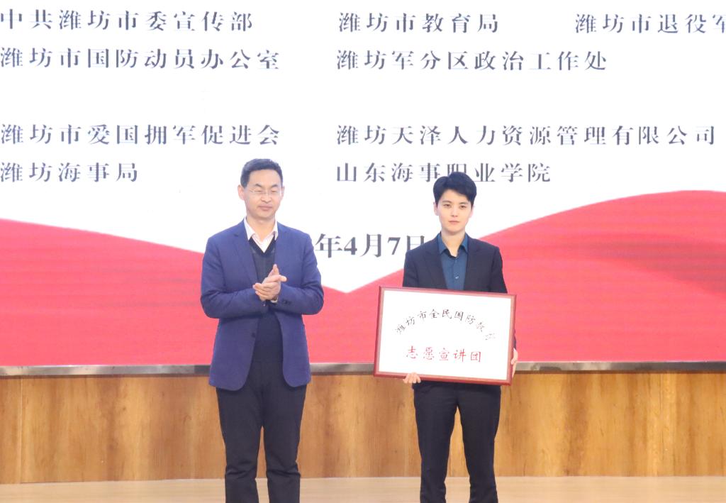 潍坊海事局、市退役军人局、市国防动员办公室、潍坊军分区政治工作处领导为潍坊市全民国防教育志愿宣讲团成员代表颁发聘书