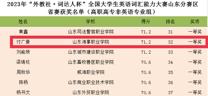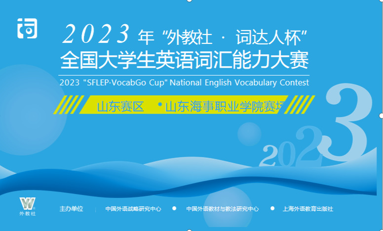 近日,2023年“外教社•词达人杯”全国大学生英语词汇能力大赛山东分赛区省赛顺利毕赛。我校在高职高专非英语专业组获得一等奖1名,二等奖10名,三等奖17名;同时我校获得山东分赛区高职高专院校优秀组织奖。