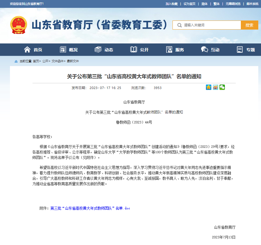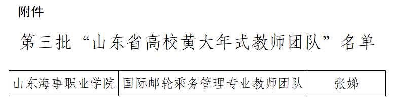 近日,山东省教育厅公布第三批“山东省高校黄大年式教师团队”名单,本次全省共评出本科和高职院校的100个教学团队,其中高职高专院校48个教学团队入选。我校邮轮游艇学院“国际邮轮乘务管理专业教师团队”成功获批为第三批“山东省高校黄大年式教师团队”。