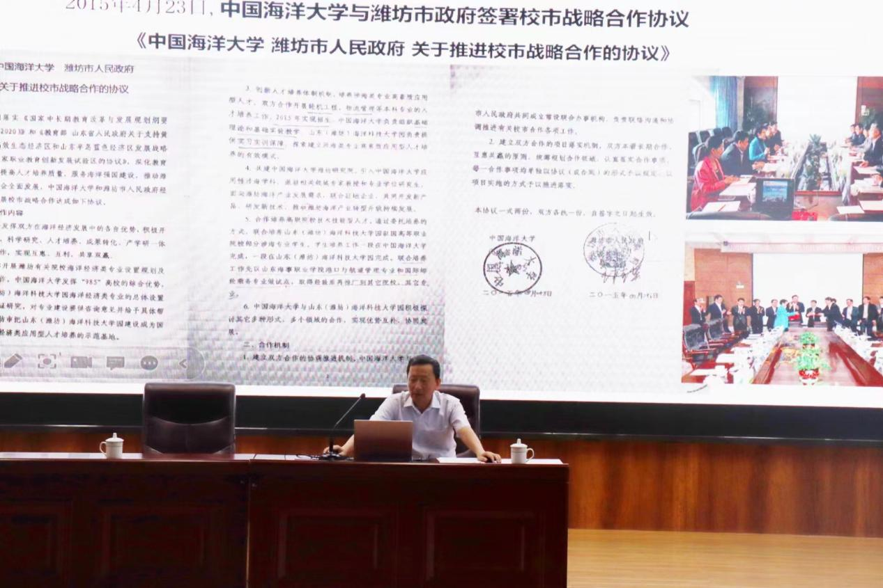 会上,刘玉强教授首先介绍了中国海洋大学以及两校“联合培养”办学情况。他表示,山东海事职业学院作为中国海洋大学合作的唯一一所高职院校,双方的合作开启了985、211教育部部属高校助力地方职业教育发展的先例。该项目重启后,双方将进一步合作共建山东海事职业学院“第一批计划升本专业”。中国海洋大学将重点在本科专业学科建设、专业人才培养方案、师资队伍建设等方面给予合作共建,助推特色品牌专业建设,强化学校办学特色,推动学校办学层次的高质量发展。同时,刘教授特别强调,我校新生将与海大学生同学习同生活,在学习生活中享受985、211国家重点大学优质教育资源,感受国家一流大学浓厚的学习氛围,使我校学生在海大教师的引领下不断提高学习理念,提升知识水平。