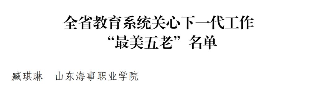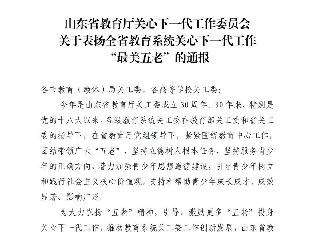 近日,山东省教育厅关心下一代工作委员会下发《山东省教育厅关心下一代工作委员会关于表扬全省教育系统关心下一代工作“最美五老”的通报》,我校教授督导室臧琪琳同志荣获全省教育系统关心下一代工作“最美五老”称号。