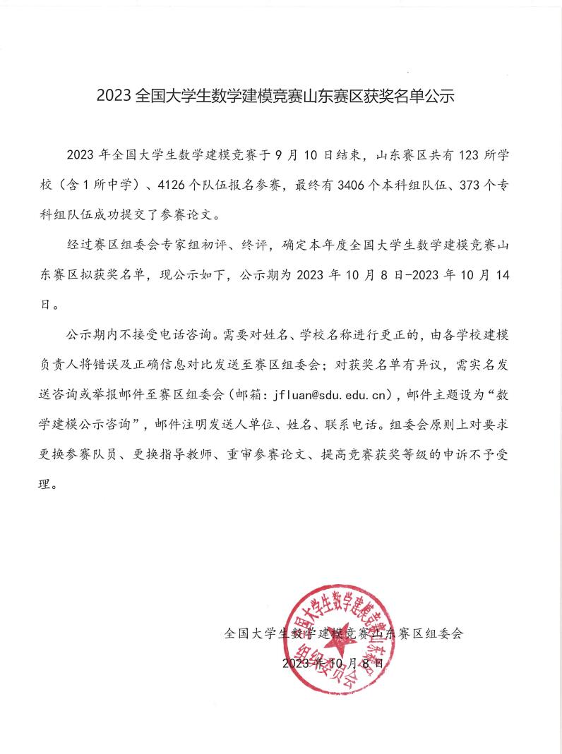 全国大学生数学建模竞赛,由教育部高等教育司与中国工业与应用数学学会联合举办的大学生科技活动,每年一届,是全国高校规模最大的基础性学科竞赛,也是世界上规模最大的数学建模竞赛。2023年全国大学生数学建模竞赛于9月10日结束,山东赛区共有123所学校(含1所中学)、4126个队伍报名参赛,最终有3406个本科组队伍、373个专科组队伍成功提交了参赛论文。经过赛区组委会专家组初评、终评,确定本年度全国大学生数学建模竞赛山东赛区拟获奖名单。港航管理学院参赛队伍克服困难积极备赛,迎难而上,最终收获比赛二等奖。