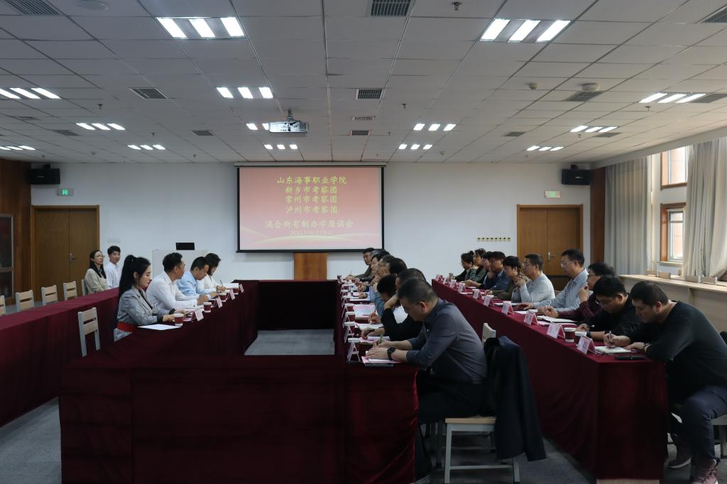 座谈前,考察团在党委委员、副校长仉继航,党委委员、副校长吕明的陪同下实地参观考察了学校航空实训基地、国际海洋工程培训中心、博能新能源技术中心、人工智能实训基地、航海虚拟仿真实训基地。座谈会上,双方立足各地职教政策发展,立足各地职教办学发展瓶颈,聚焦混合所有制办学内涵、办学改革途径、产教融合方式、校企合作育人体系、人才培养制度、二级学院(产业学院)建设和职教高考等内容进行了深入交流研讨。