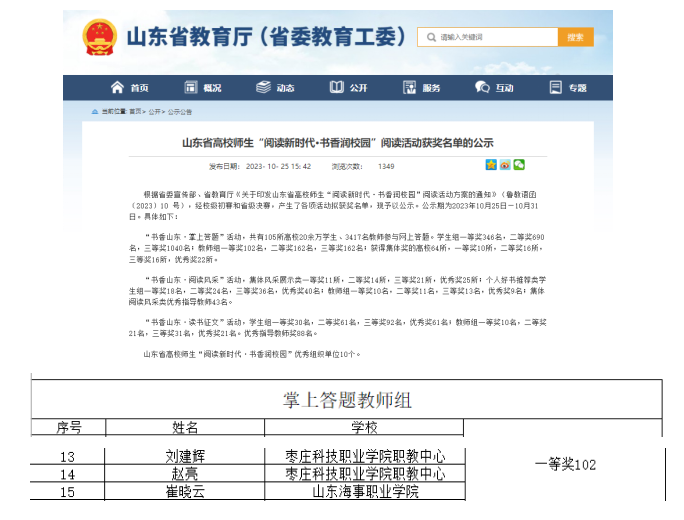 近日,山东省委宣传部、山东省教育厅公布《山东省高校师生“阅读新时代·书香润校园”阅读活动获奖名单》,我校基础部教师崔晓云在“书香山东·掌上答题”中获得教师组一等奖。