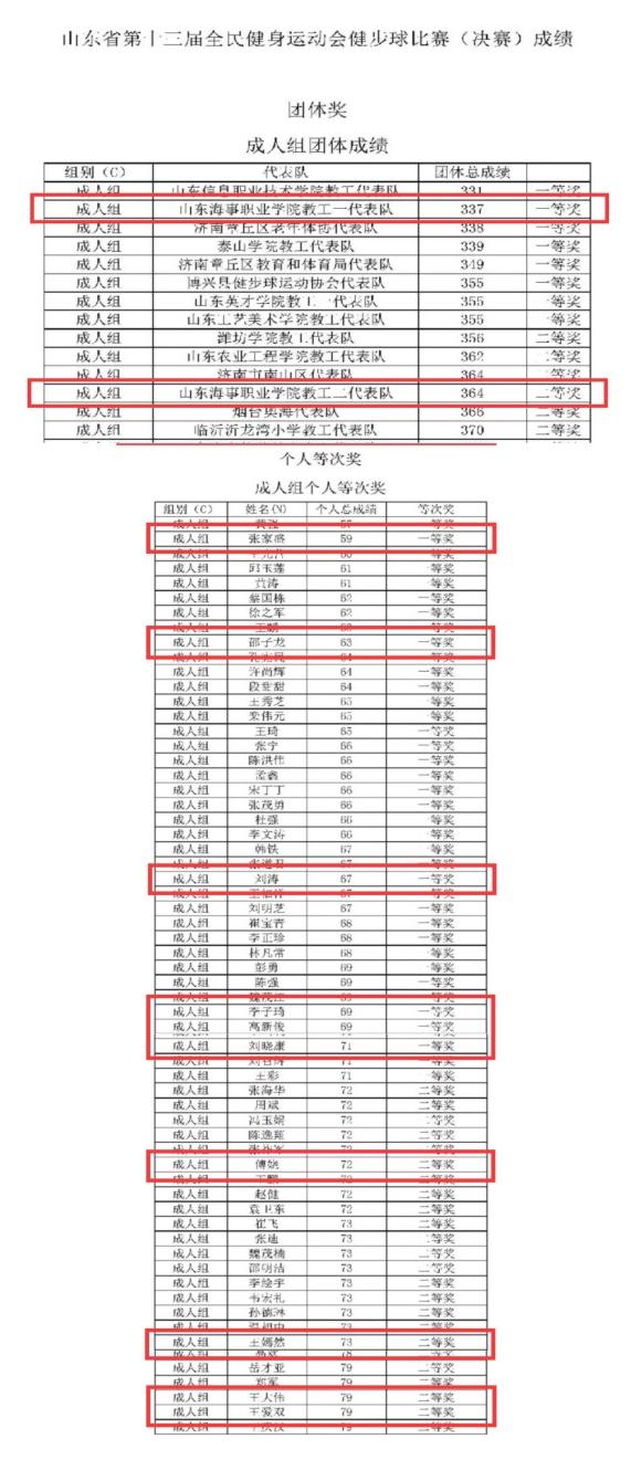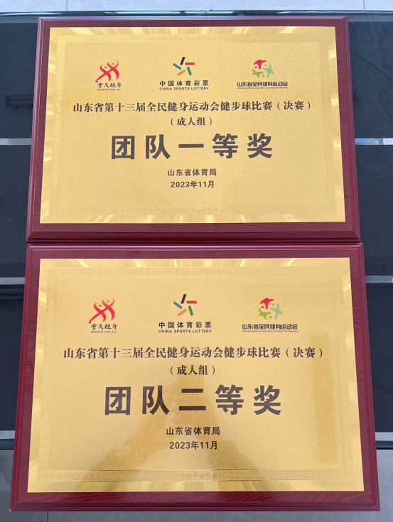近日,山东省第十三届全民健身运动会健步球比赛(决赛)在潍坊落下帷幕。来自全省16地市的60多支代表队参加了比赛。我校组建两支代表队参与成人组的比赛,获得团体一等奖一项,团体二等奖一项,个人一等奖6人,个人二等奖4人。