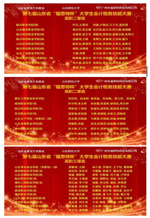 近日,由山东省教育厅高教处主办的山东省第七届“福思特杯”大学生会计税务技能大赛落下帷幕。来自全省高职院校的140支队伍同台竞技,经过3个小时的合作与拼搏,我校港航管理学院大数据与会计专业3支队伍参赛荣获二等奖2项、三等奖1项。由学生张文鑫、袁浩芳、张晓玲、梁亿超、郭景飒、高磊组成的“山东海事职业学院1队”夺得二等奖(指导教师:程美旺、张滢、陈铭志 );由学生周婌影、高嘉、谈浩、彭新淇、侯丽娜、岳朝阳组成的“山东海事职业学院2队夺得二等奖(指导教师:张滢、程美旺、王颖);由学生学生郭鑫、郭秋雨、 胡军、许胜楠、刘子涵、卢羿冰组成的“山东海事职业学院3队”夺得大赛三等奖(指导教师:程美旺、张滢、季丹丹) 。