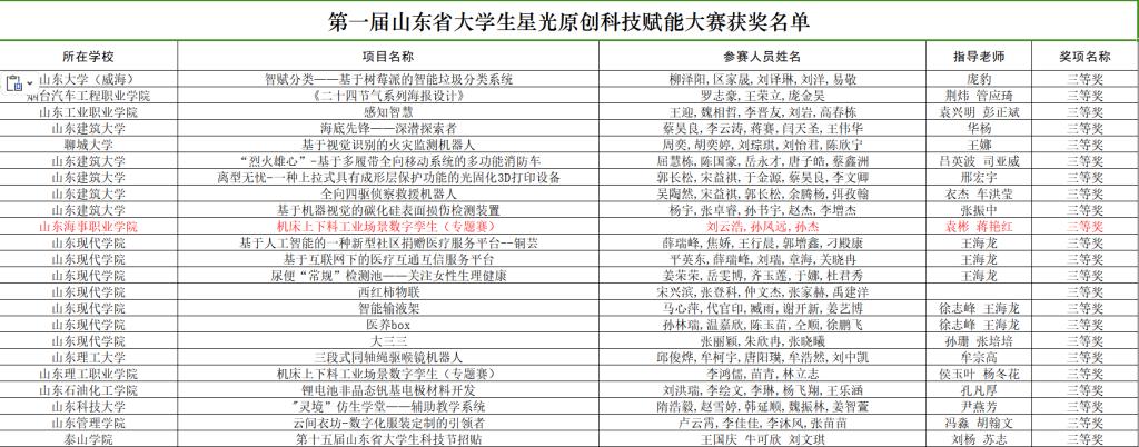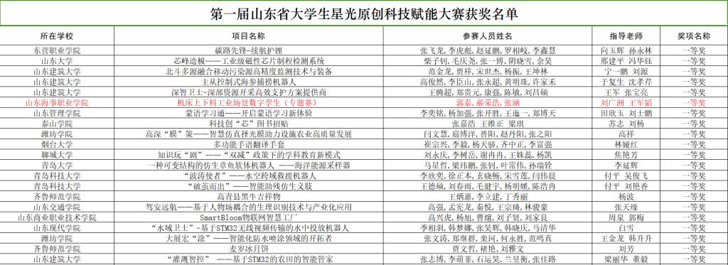 近日,由山东省科学技术协会、山东省教育厅、共青团山东省委员会、山东省发展和改革委员会、山东省工业和信息化厅、山东省人力资源和社会保障厅联合主办的第十五届山东省大学生科技节——首届山东省大学生星光原创科技赋能大赛落下帷幕。我校王军韬、刘广洲老师指导的郭泰、郝荣浩、张涵三人参赛团队获学生组一等奖;由袁彬、蒋艳红老师指导的刘云浩、孙凤远、孙杰三人参赛团队组获学生组三等奖。
