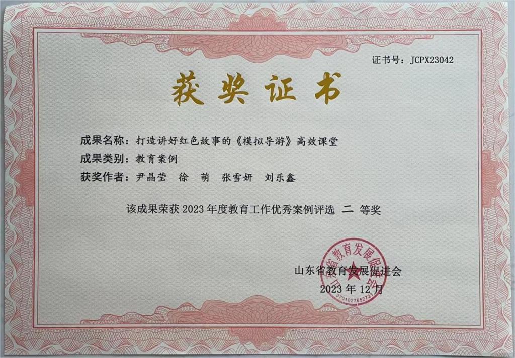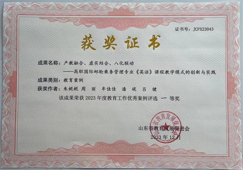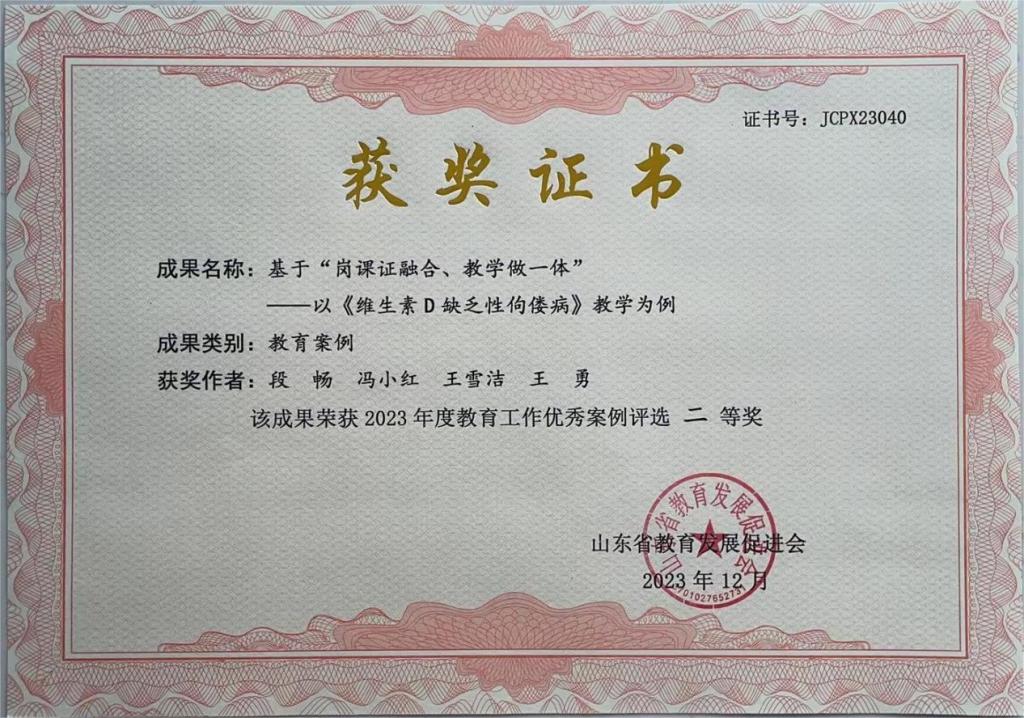 近日,山东省教育发展促进会授予我校“教育科研基地”荣誉称号,同时,我校推选的4项教育工作案例成功入选“2023年度教育成果优秀案例”。我校马广永老师主持的《学校治理体系的优化与完善——全面推进“共融共建”,实现校企“双主体育人”》和朱妮妮老师主持的《产教融合、虚实结合、八化联动:高职国际邮轮乘务管理专业<英语>课程教学模式的创新与实践》荣获一等奖;尹晶莹老师主持的《打造讲好红色故事的<模拟导游>高效课堂》和段畅老师主持的《基于“岗课证融合、教学做一体”—以<维生素D缺乏性佝偻病>教学为例》荣获二等奖。此次获奖标志着我校在教育科研领域迈出了重要的一步。