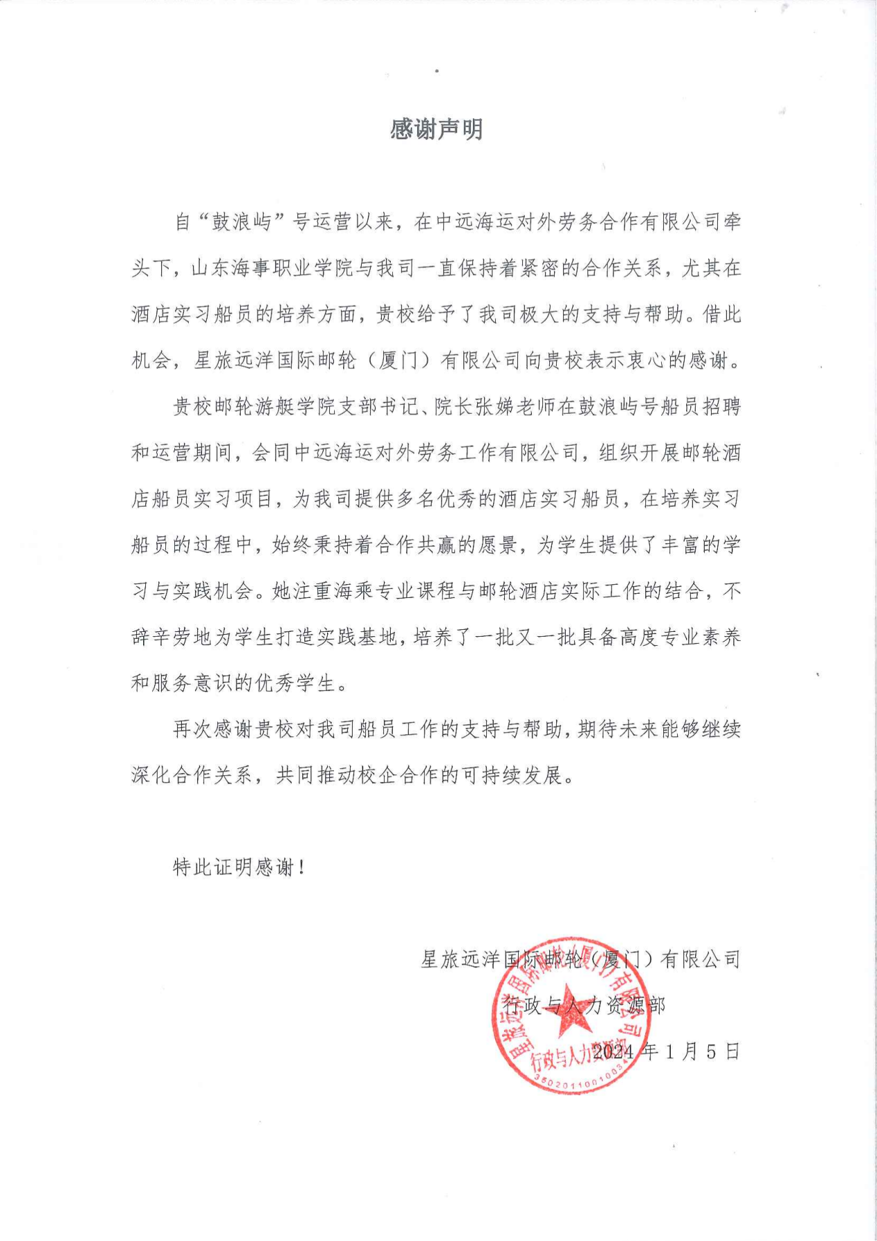 近日,我校邮轮游艇学院收到了星旅远洋国际邮轮(厦门)有限公司(以下简称“星旅远洋国际邮轮”)发来的感谢信。信中,星旅远洋国际邮轮对我校在酒店实习船员的培养及诸多人才培养工作的深度参与和贡献表示高度赞赏,并表示期待未来能进一步拓宽和加深与我校的合作,以共同推动双方在邮轮产业的发展上取得更大的成功。同时,星旅远洋国际邮轮表示,愿意进一步探索与我校在更多领域的合作可能性,共同为我国邮轮产业的繁荣发展做出更大的贡献。