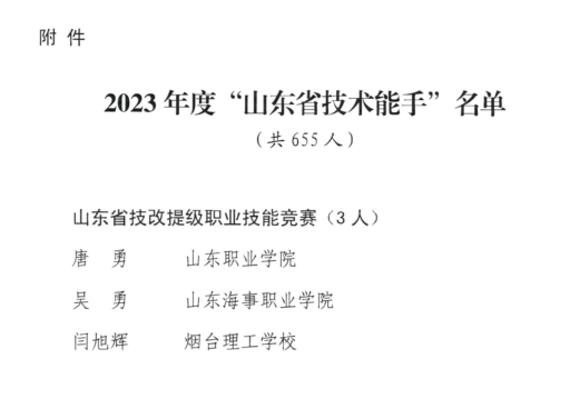 近日,山东省人力资源和社会保障厅印发《关于公布2023年度“山东省技术能力”名单的通知》(鲁人社字〔2024〕23号),我校机电工程学院吴勇老师获评“山东省技术能手”荣誉称号。