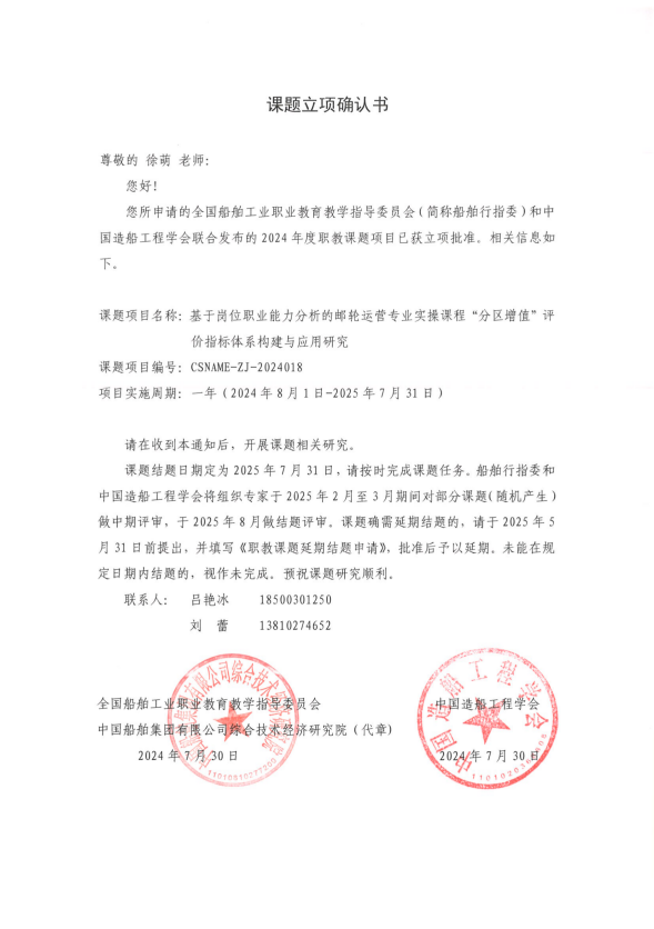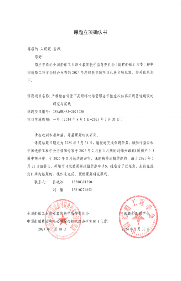近日,国家船舶工业职业教育教学指导委员会与中国造船工程学会联合公布2024年度职教课题项目立项结果,我校朱妮妮老师主持的《产教融合背景下高职邮轮运营服务示性虚拟仿真实训基地建设的研究与实践》、王文婧老师主持的《基于邮轮运营服务专业群岗位职业能力分析的“三双”实践教学体系研究与实践》、尹晶莹老师主持的《数字经济背景下高职课堂数字化教学改革路径研究》以及徐萌老师主持的《基于岗位职业能力分析的邮轮运营专业实操课程“分区增值”评价指标体系构建与应用研究》4项课题获批立项。我校将以此为契机,进一步优化科研管理服务体系,为课题研究提供全方位的支持与保障,确保研究工作的顺利进行和高质量完成。