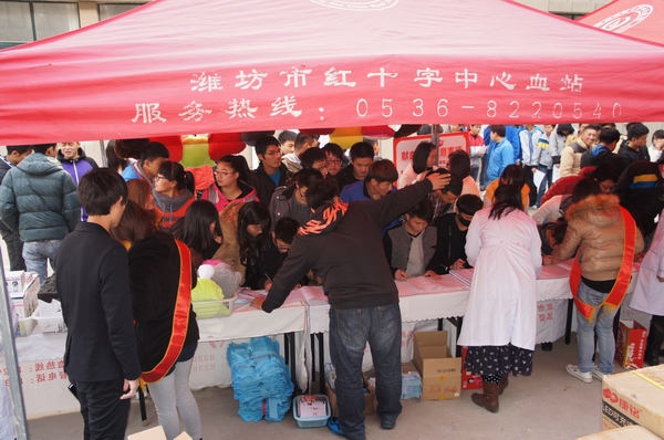 今年自入冬以来,全国多个省市均出现了“血荒”,11月份,潍坊市中心血站血库告急,我院团委学生处、学生会立即响应,通过学院宣传栏和海报、召开学生义务献血动员会等平台,号召广大学生踊跃参加义务献血活动。
