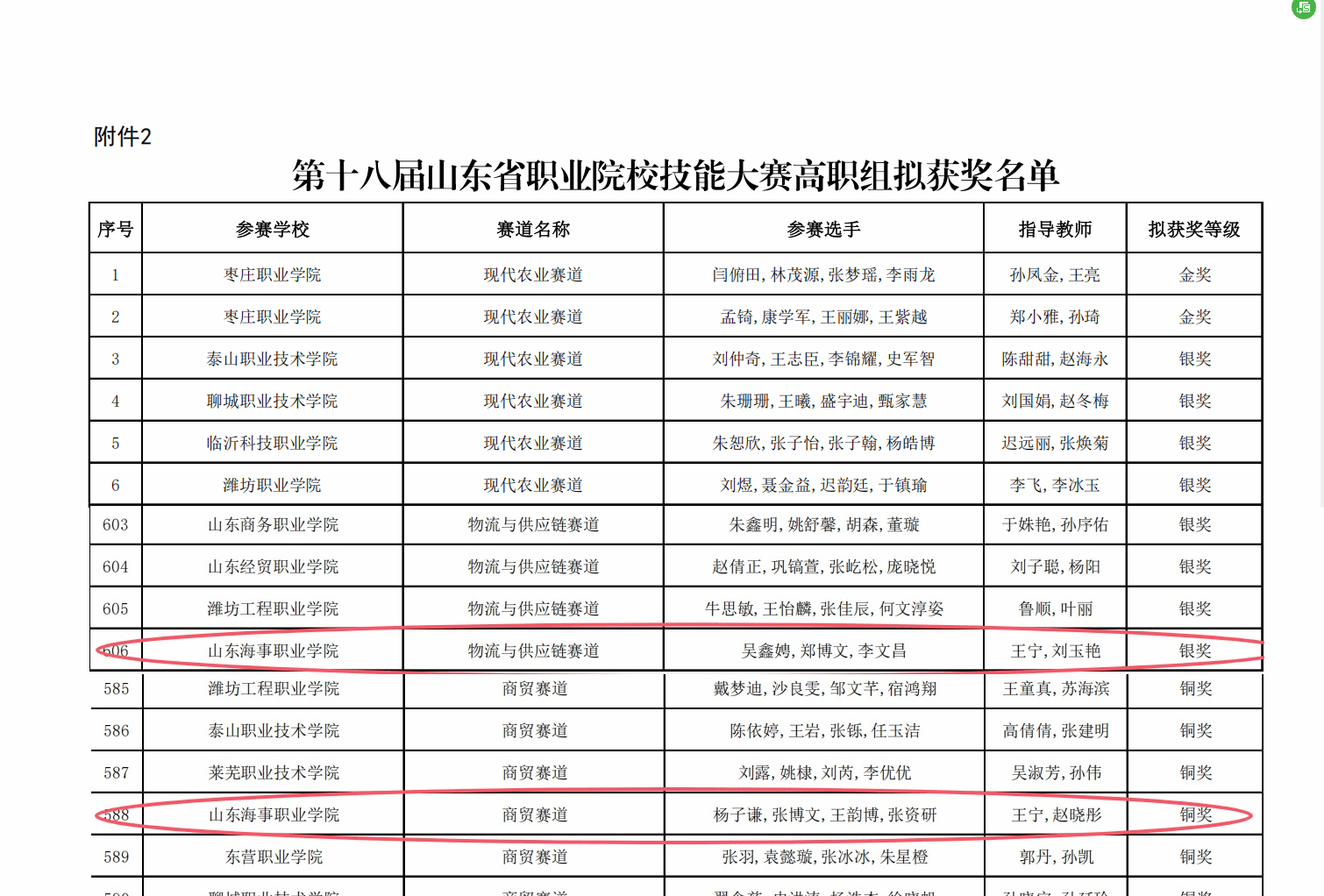 近日,第十八届山东省职业院校技能大赛落下帷幕,港航管理学院学生斩获大赛银奖、铜奖各一项。由王宁、刘玉艳两位老师带领吴鑫娉、郑博文、李文昌三名同学参与物流与供应链赛道比拼,凭借学生扎实的专业功底和稳定的临场发挥,最终斩获高职组银奖;由王宁、赵晓彤两位老师带领杨子谦、张博文、王韵博、张资研四名同学参与商贸赛道比拼,最终斩获高职组铜奖。