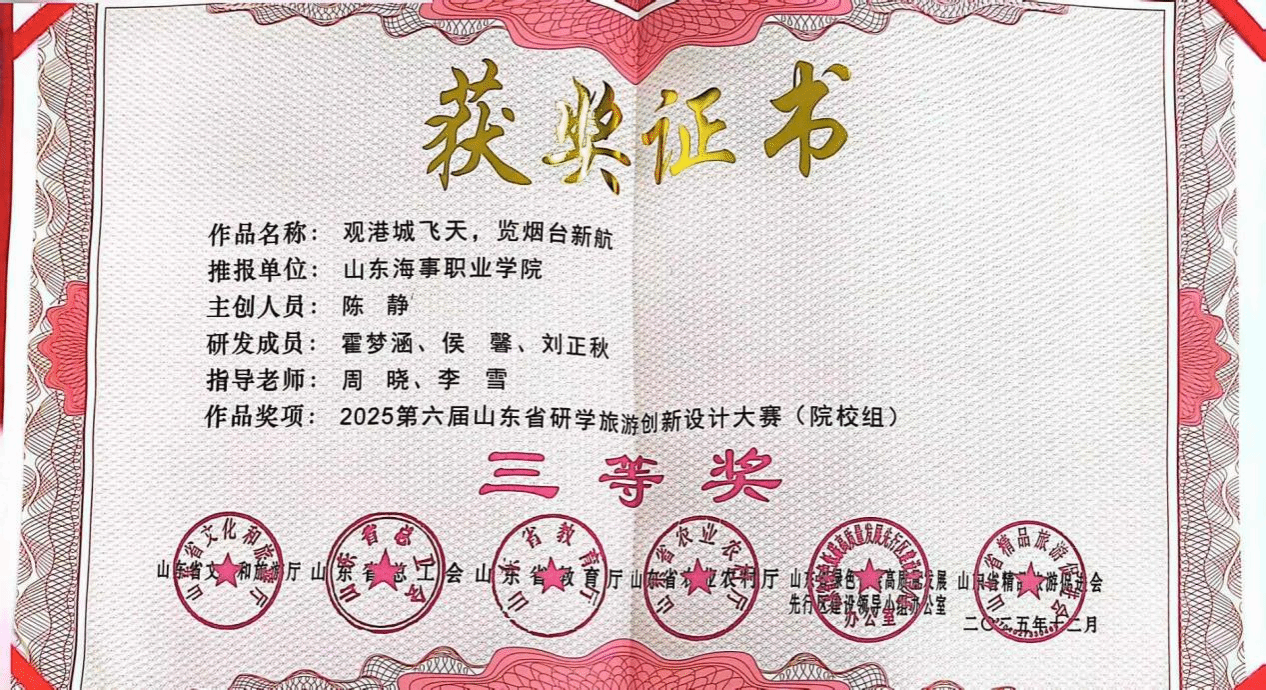 近日,2025年第六届山东省研学旅游创新设计大赛总结大会暨成果展在圆满落幕。学校邮轮游艇学院旅游管理专业陈静、刘正秋、侯馨、霍梦涵四位同学合作完成的作品《观港城飞天,览烟台新航》,凭借扎实的专业素养与创新的设计思路,在全省6360余件参赛作品中脱颖而出,荣获大赛三等奖。